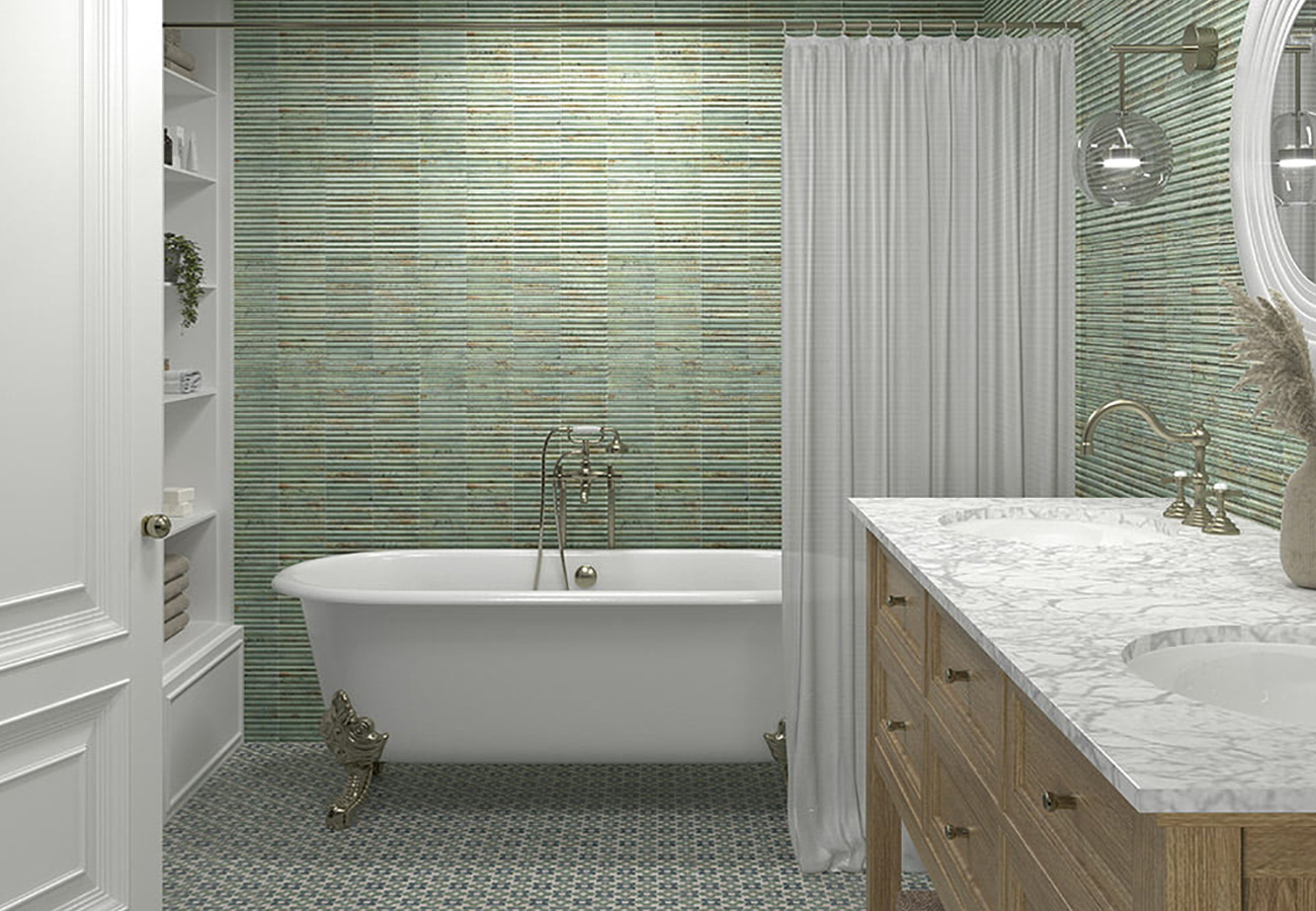El diseño del Azulejo Aquamarine Lugano está inspirado en la estética vintage y en el estilo metálico, lo que le da un toque elegante y sofisticado, pero al mismo tiempo rústico y contemporáneo. Los tonos verdes y azules que se combinan de forma natural en su superficie reflejan un estilo moderno que se adapta perfectamente a las tendencias actuales. Su estructura tiene una destonificación V3, lo que le proporciona variabilidad tonal y un acabado único en cada pieza, lo que le otorga una personalidad especial.