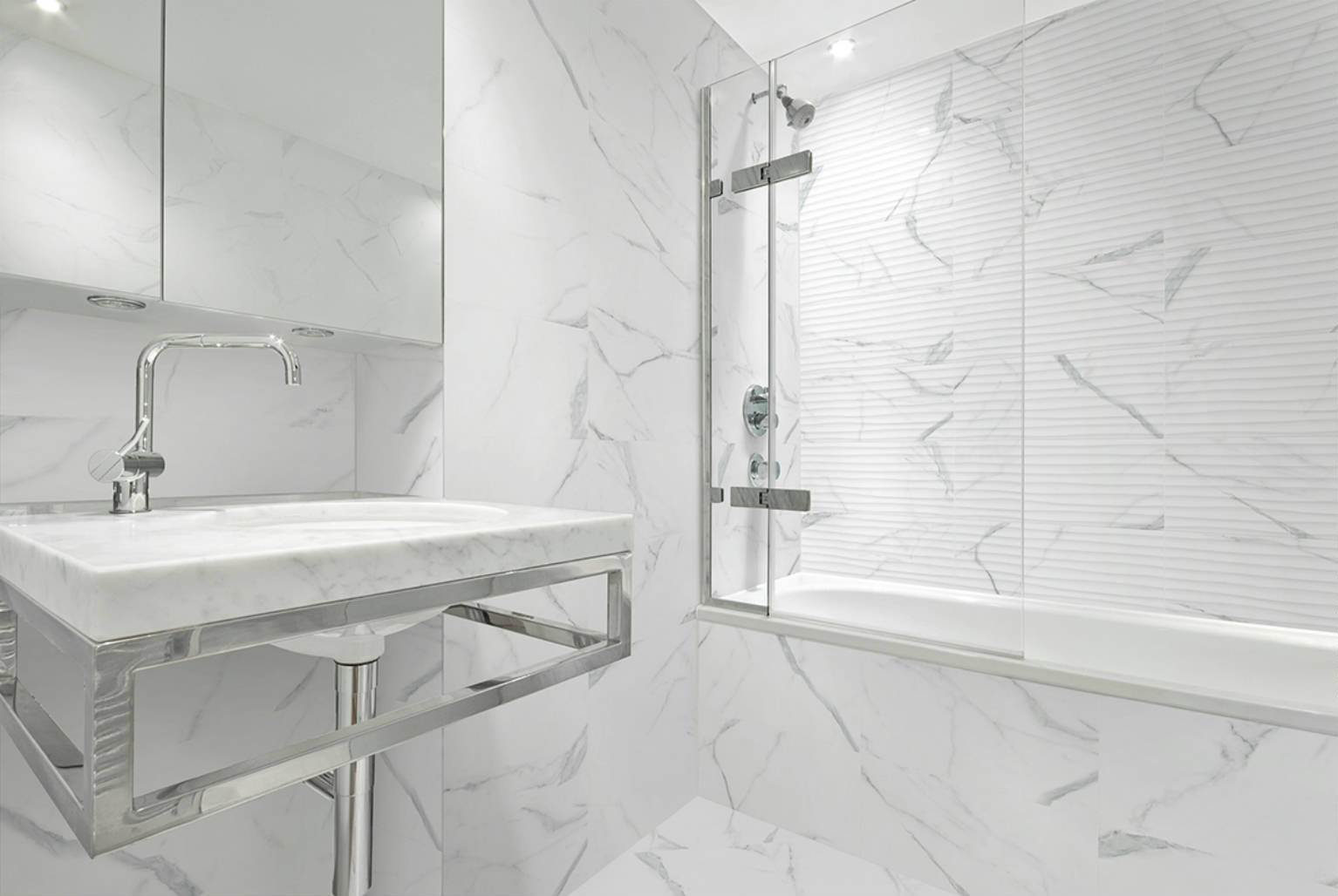 El azulejo decorado Alma 30×60 blanco efecto mármol es un revestimiento cerámico ideal para paredes decorativas en baños y cocinas. Su diseño con relieve sutil aporta dinamismo sin recargar el espacio.