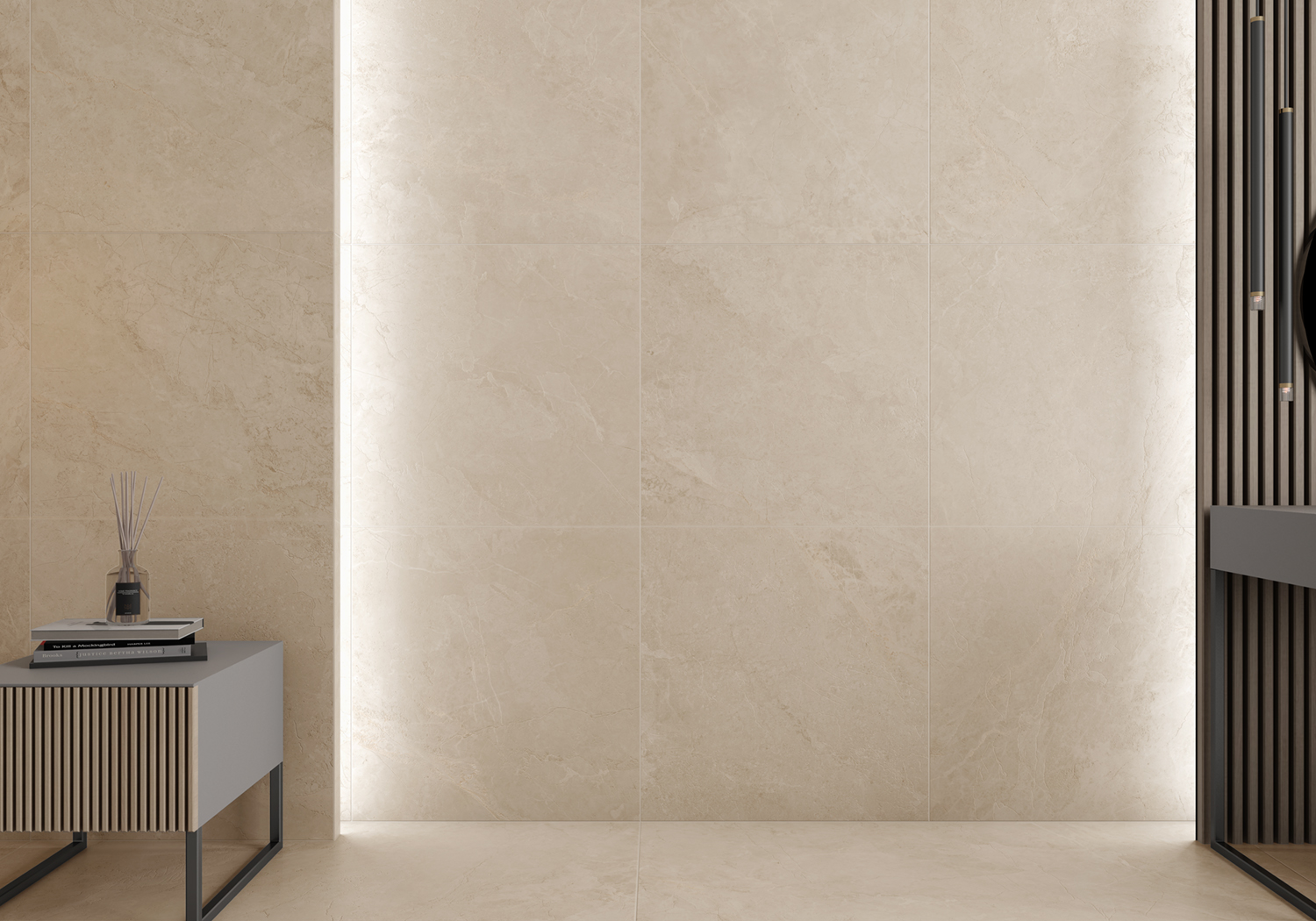 El acabado mate realza su efecto piedra y reduce reflejos, aportando una imagen más natural y sofisticada. Gracias a su rectificado, permite una colocación precisa con juntas mínimas, logrando mayor continuidad visual y un acabado uniforme.