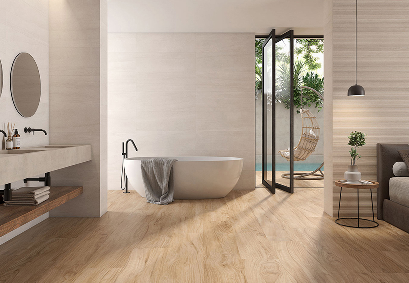 Disponible en formato 20×120 cm, se convierte en una solución versátil para salones, dormitorios, cocinas, baños, oficinas y espacios comerciales, además de terrazas y exteriores cubiertos. Su tonalidad natural y neutra crea una sensación de amplitud y luminosidad, aportando una estética cálida y acogedora en cualquier ambiente.