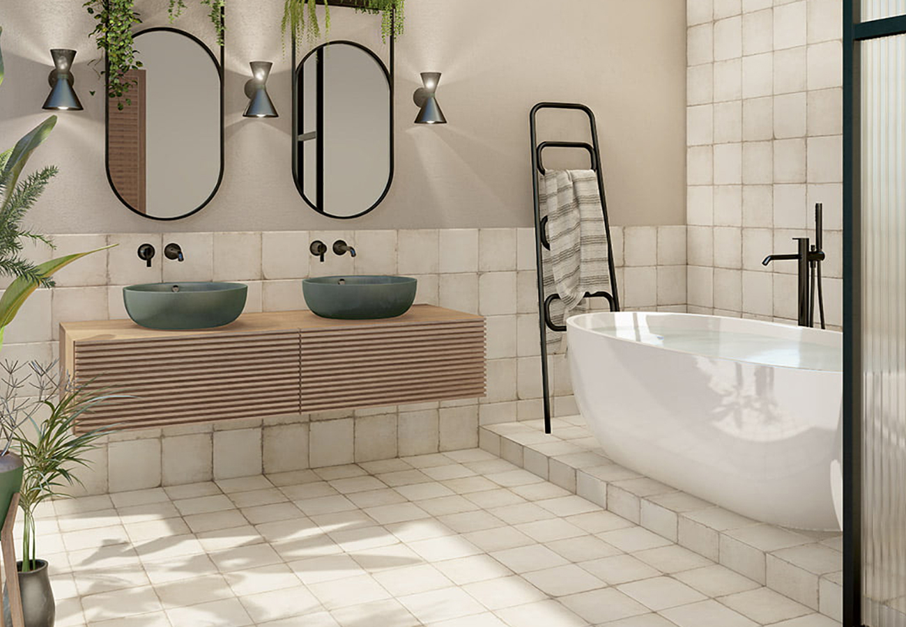 El diseño de la serie Bottega se inspira en la cerámica tradicional mediterránea. La destonificación V3 genera ligeras variaciones entre piezas, creando superficies más dinámicas y auténticas.