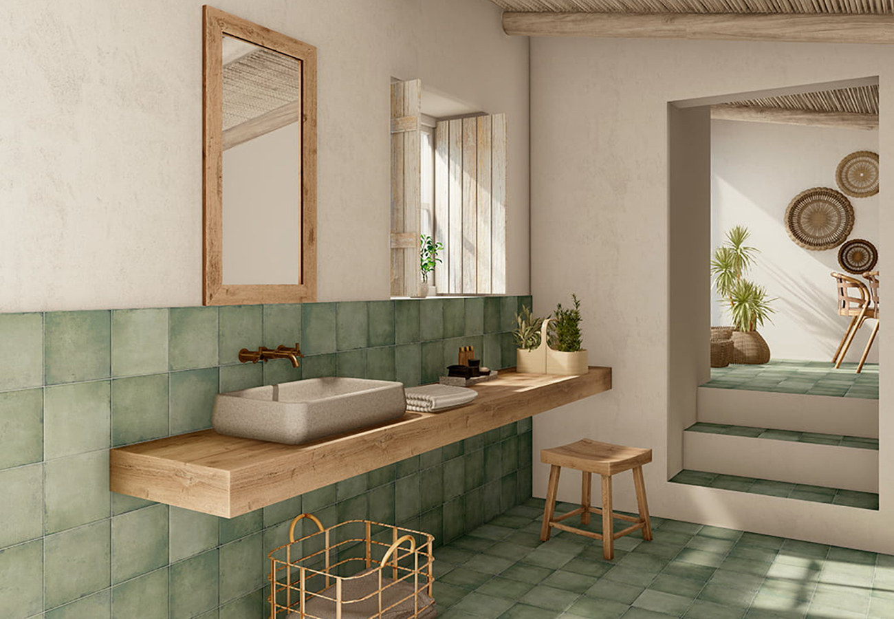 El diseño de la serie Bottega se inspira en la cerámica tradicional mediterránea. La destonificación V3 genera ligeras variaciones entre piezas, creando superficies más dinámicas y auténticas.