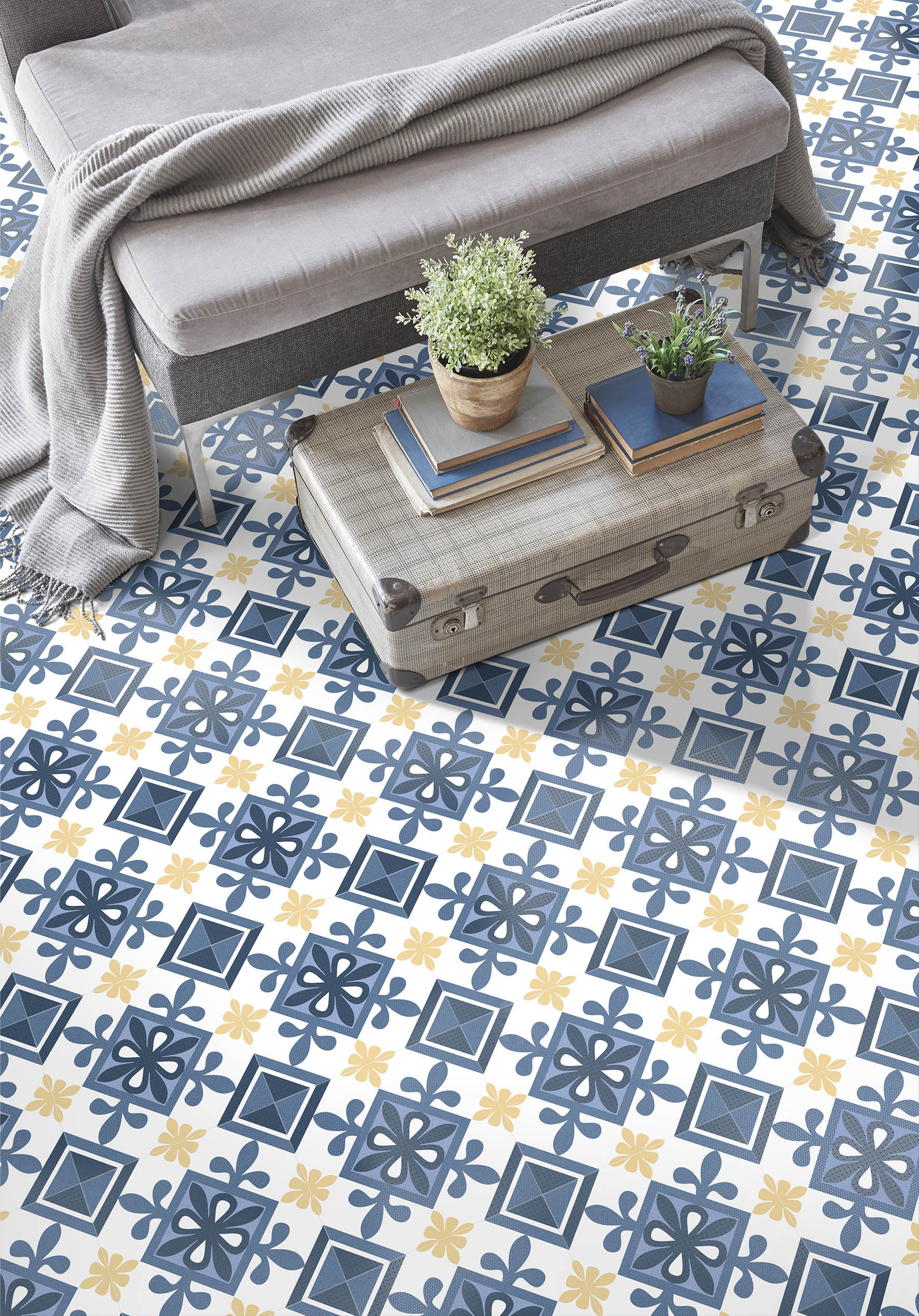 Diseño geométrico más estructurado y contemporáneo, que recuerda a los suelos de patios andaluces reinterpretados en clave actual.