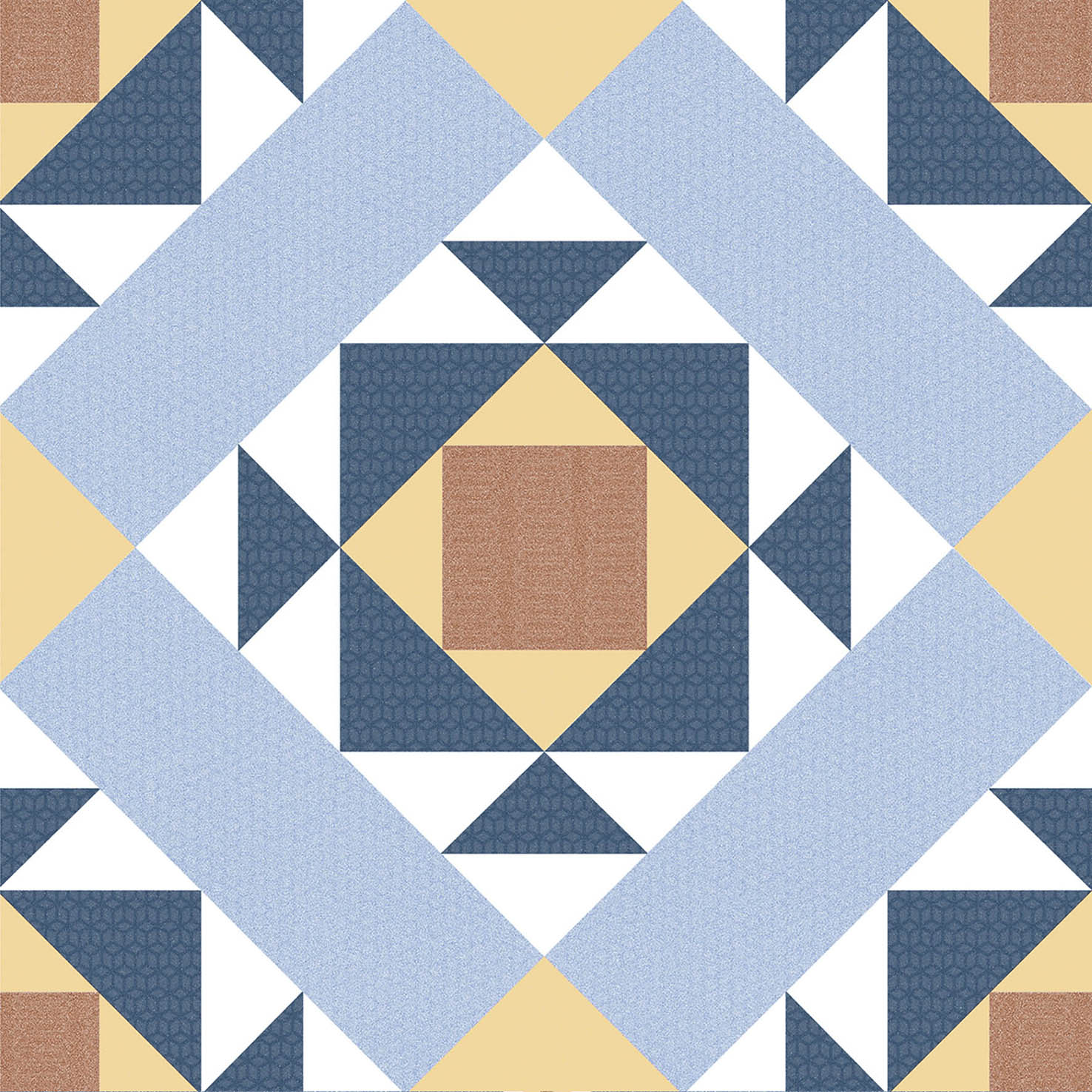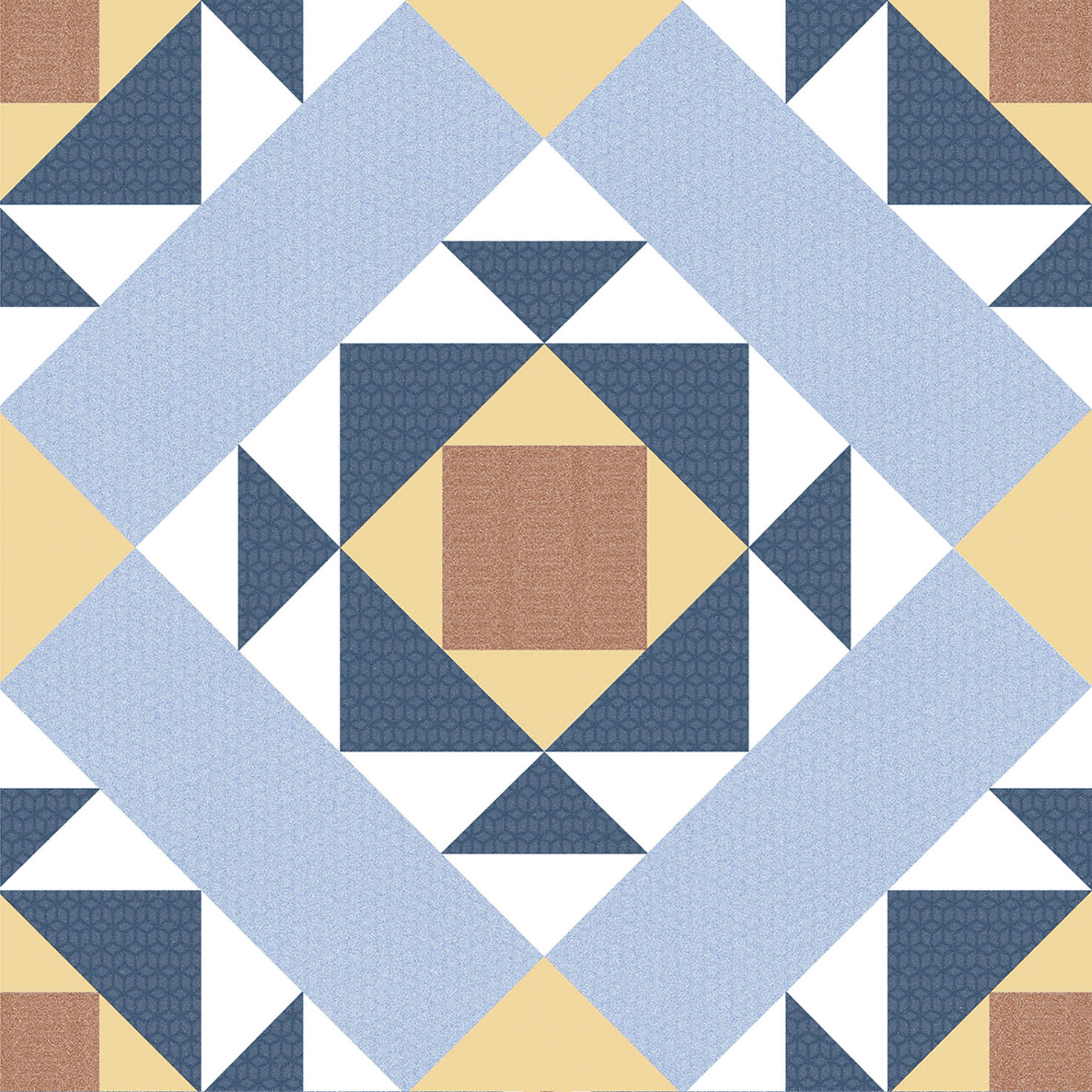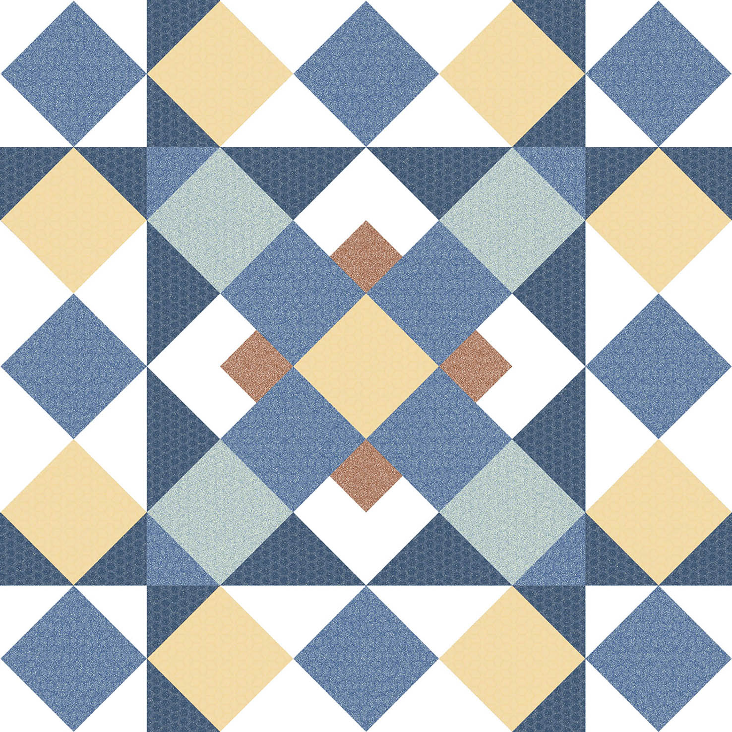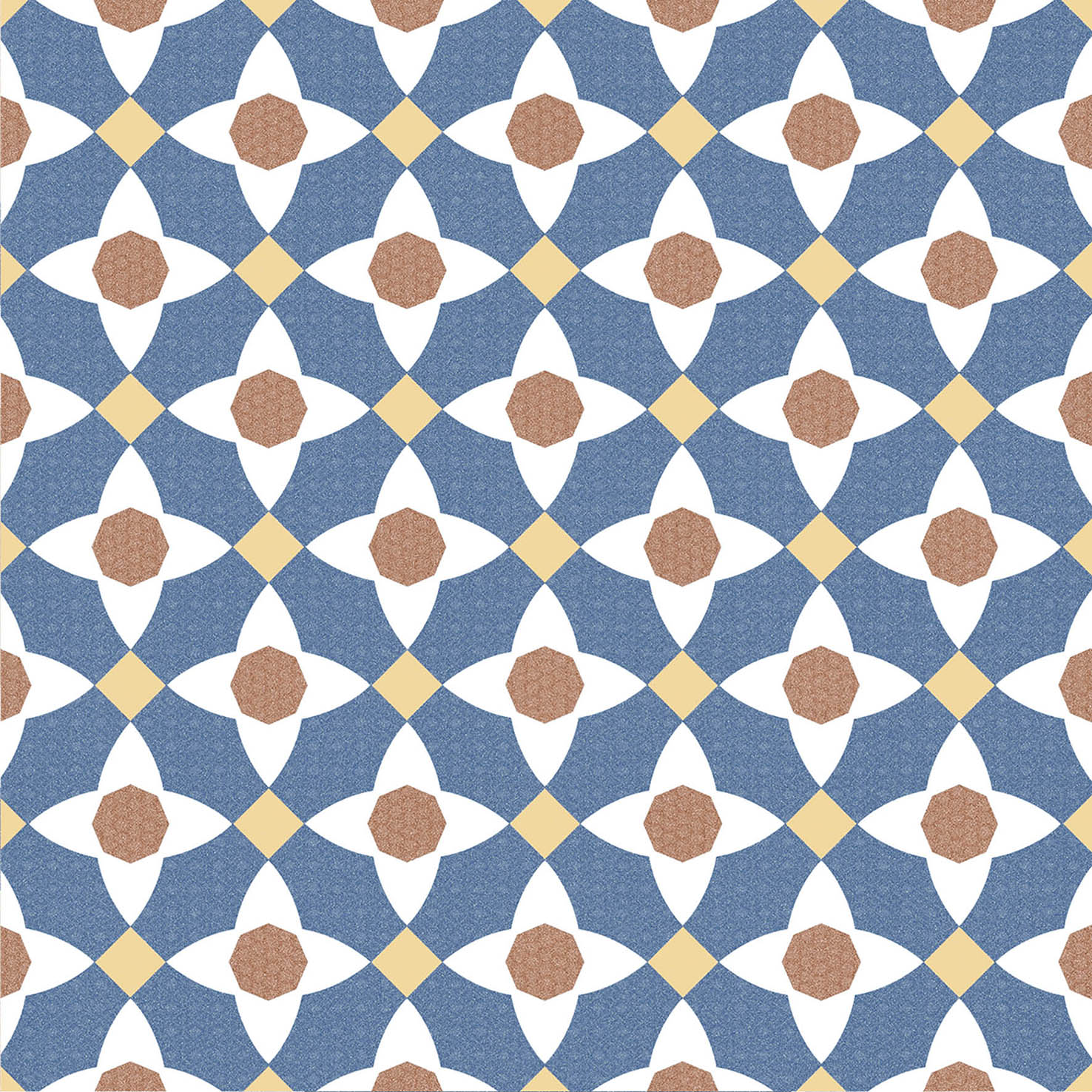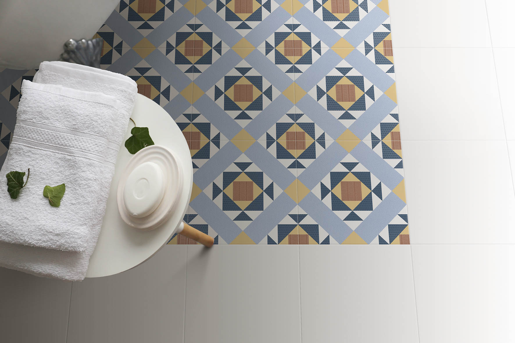 Un patrón en forma de aspa con equilibrio cromático y aire tradicional. Perfecto para suelos protagonistas en cocinas o baños.