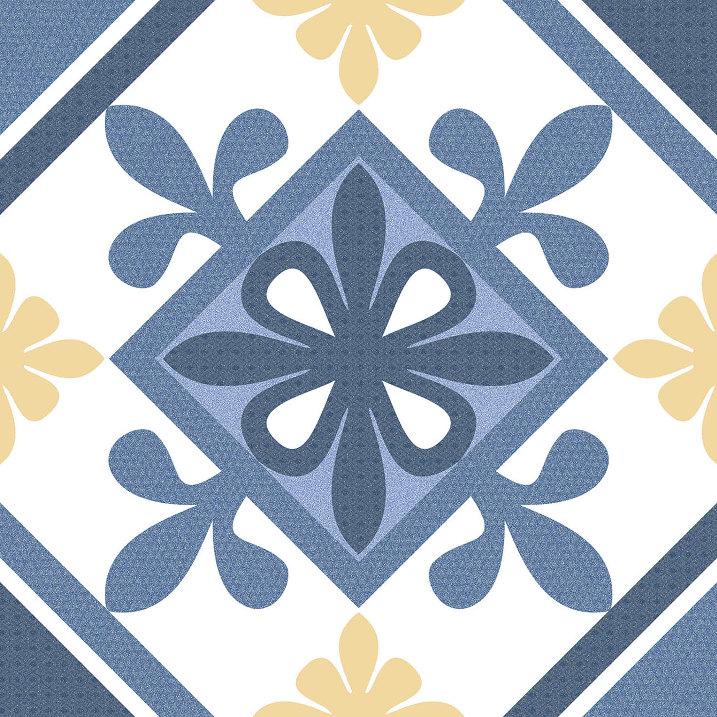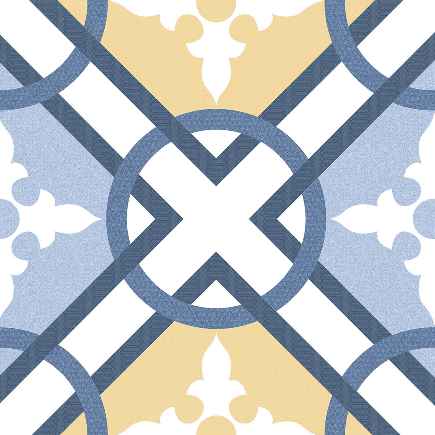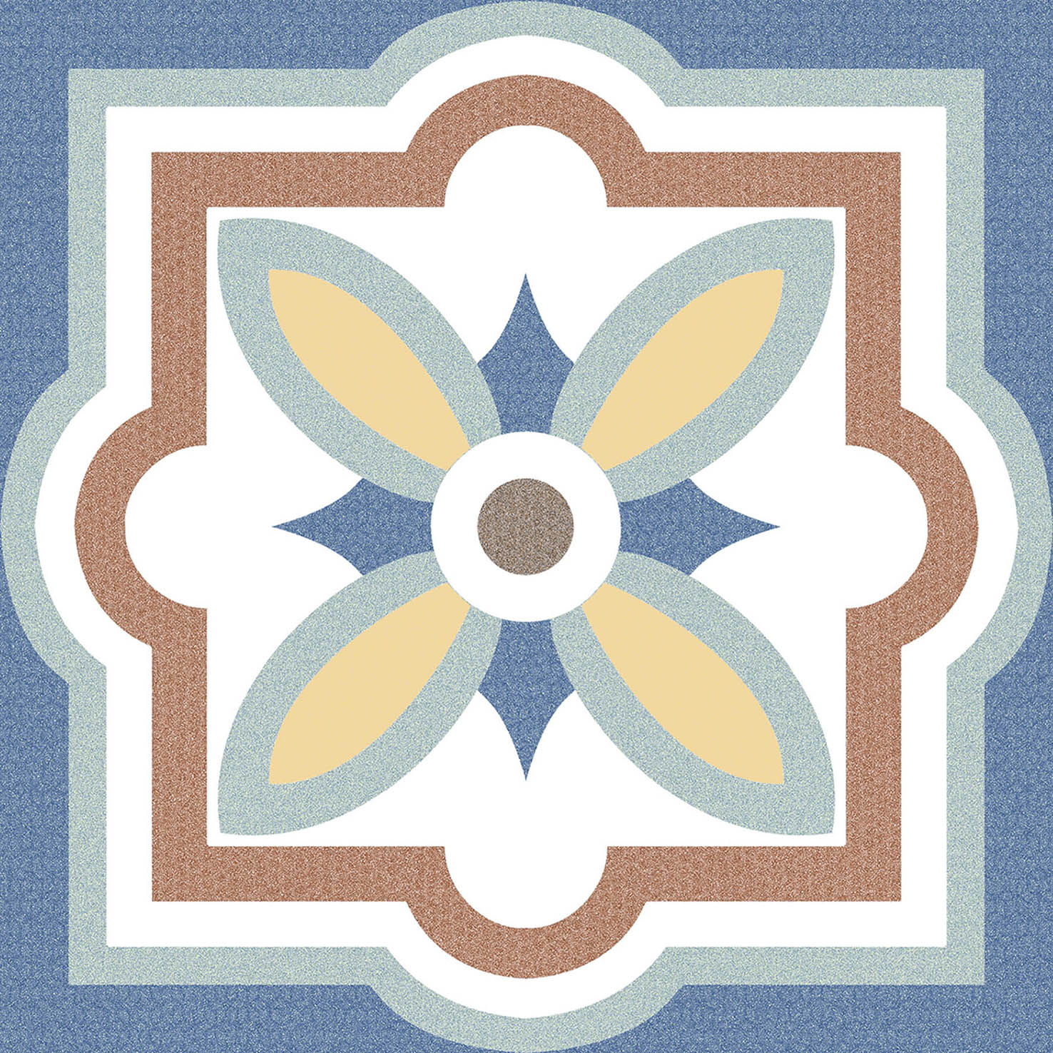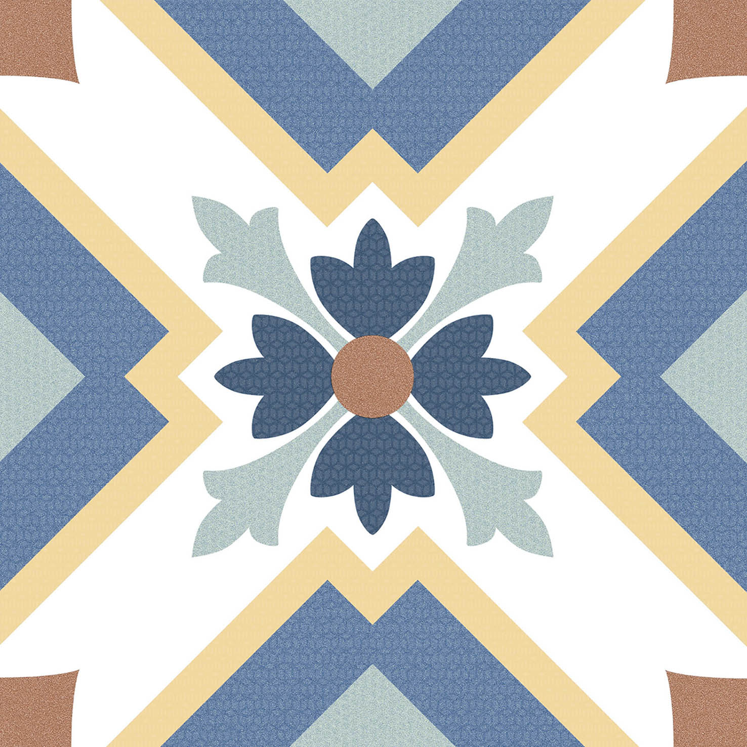 Un diseño elegante con geometría central marcada y combinación de tonos azules y matices cálidos. Ideal para ambientes clásicos renovados o espacios mediterráneos.