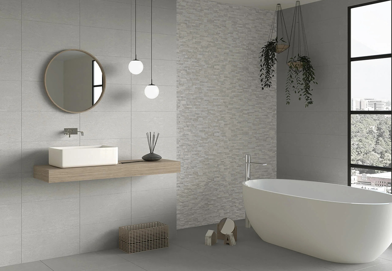A diferencia de la piedra natural, este azulejo para baño combina el aspecto del gres porcelánico imitación microcemento con las ventajas de un material más ligero, resistente y de fácil mantenimiento. Su acabado mate contribuye a una apariencia más natural, reduciendo reflejos y proporcionando una sensación de calidez en el ambiente.