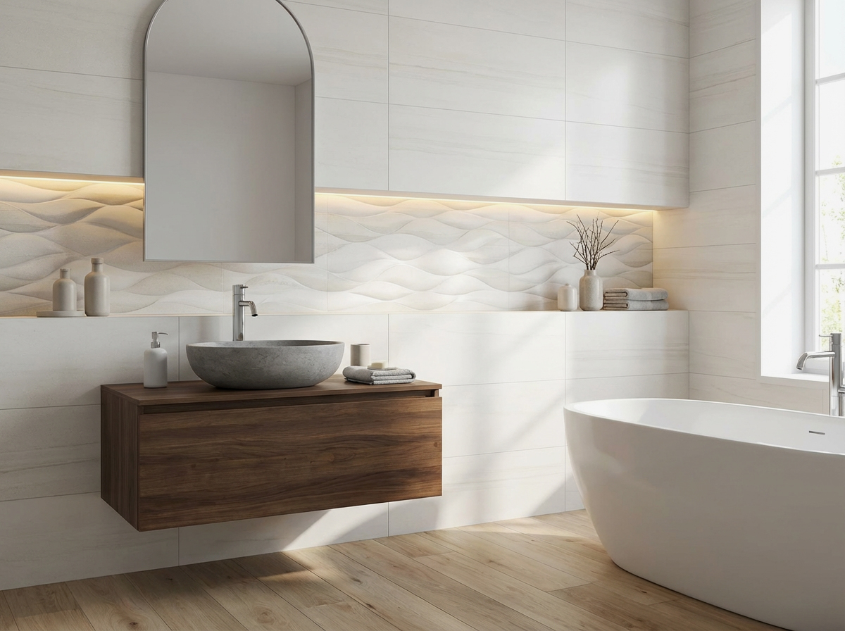 La combinación del azulejo base Pearl con el relieve RLV Dart Pearl permite diseñar espacios con mayor dinamismo visual sin perder la uniformidad cromática, logrando ambientes modernos y acogedores.