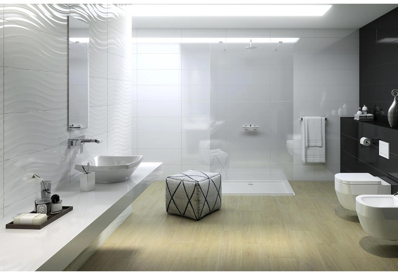 El Ondas Blanco Brillo también es ideal para combinar con otros materiales. Por ejemplo, se puede usar junto con pavimentos que complementen su estilo, como el modelo Tioga 20×60 cm, para crear una atmósfera armoniosa y equilibrada. La combinación de estos dos productos aporta una sensación de continuidad visual, haciendo que los espacios se vean más amplios y coordinados. Esta capacidad de combinarse con otros productos permite a los diseñadores de interiores jugar con diferentes texturas y estilos, brindando un resultado final único y personalizado.