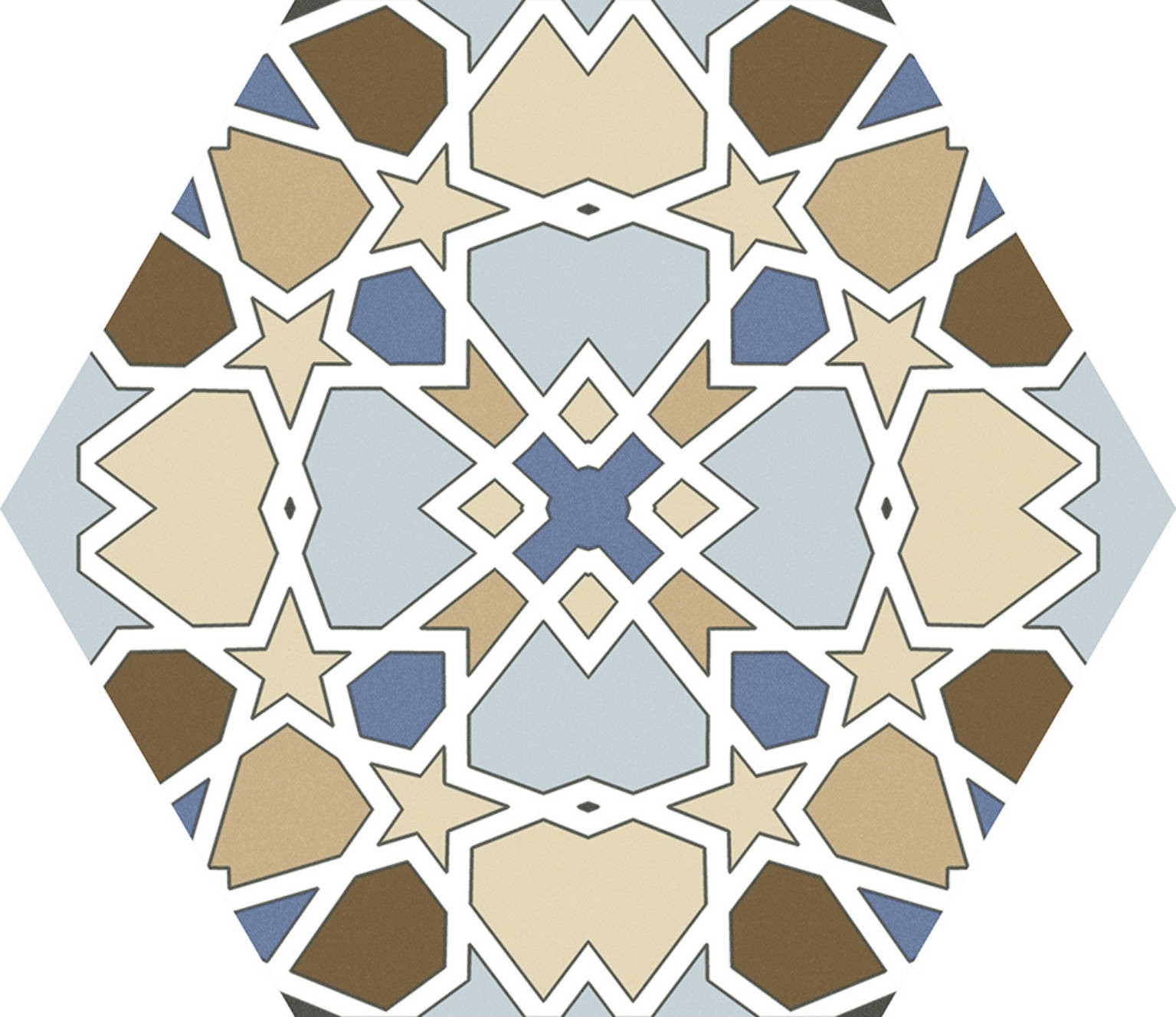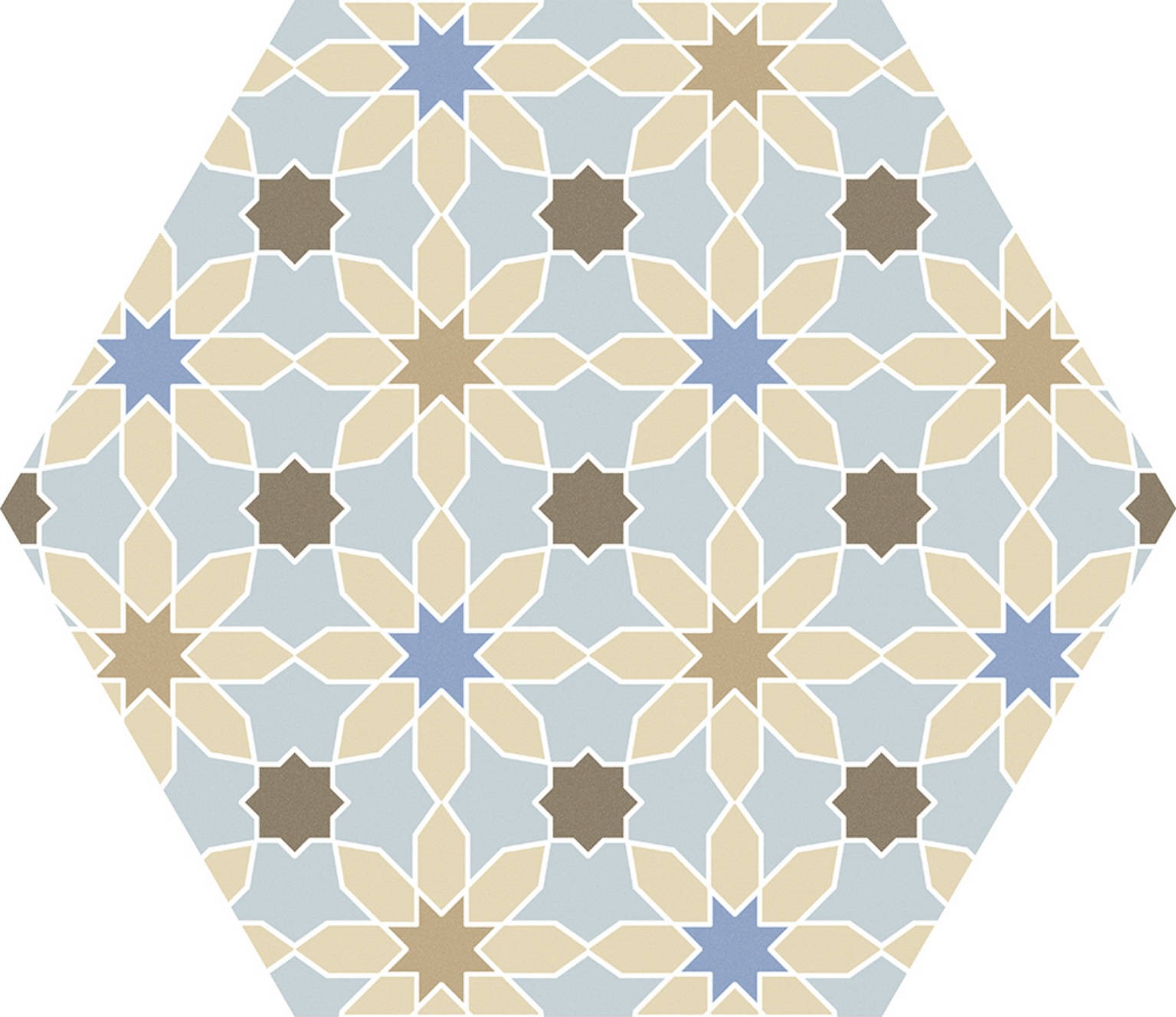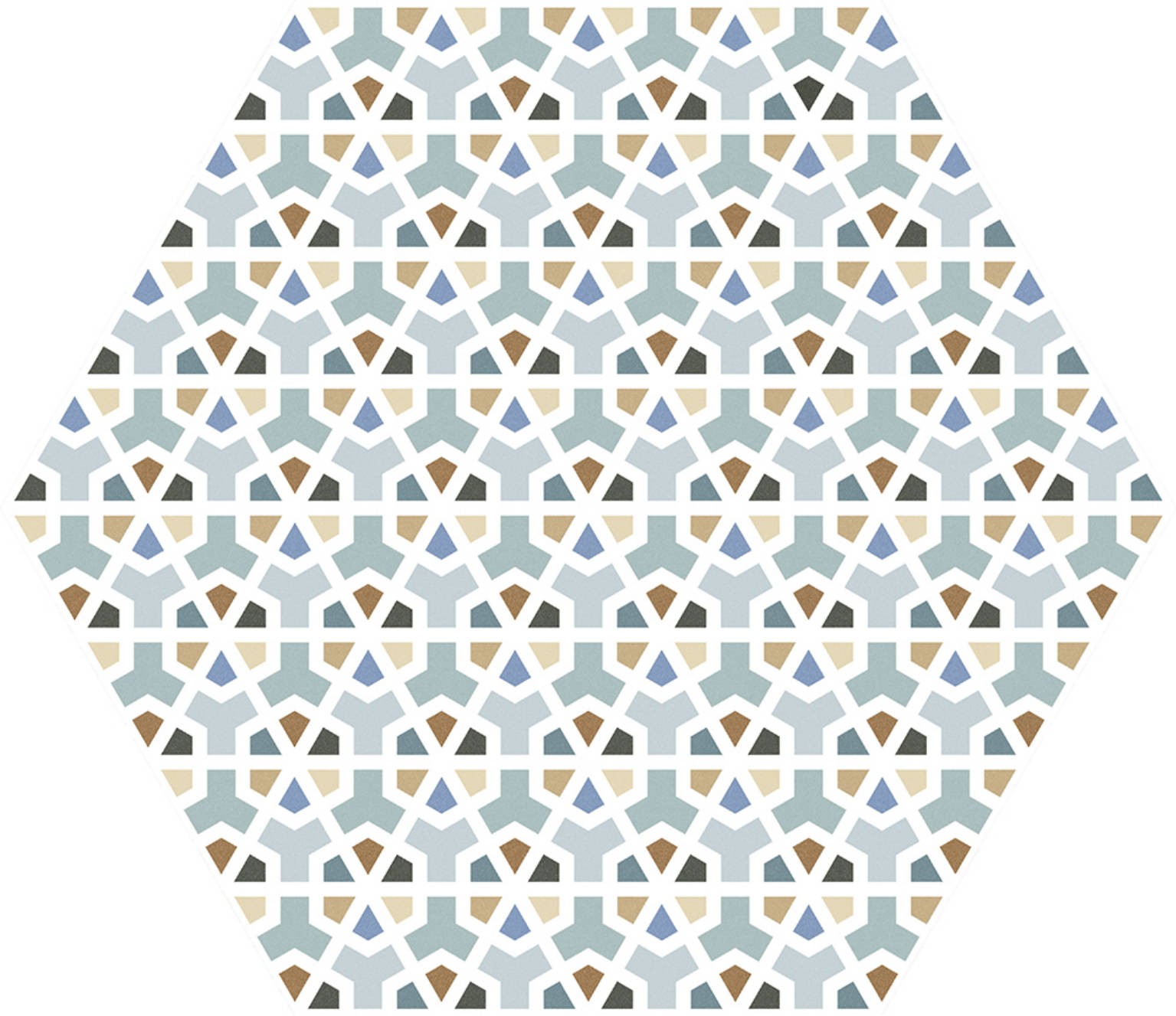 Hexa Al-Andalus Mix es una baldosa porcelánica esmaltada con formato hexagonal 23×27 cm, pensada para aportar originalidad, color y dinamismo a cualquier ambiente. Inspirada en los tradicionales suelos hidráulicos, esta colección combina la esencia de lo clásico con una estética moderna y atrevida, gracias a sus 24 diseños diferentes mezclados de forma aleatoria en cada caja.