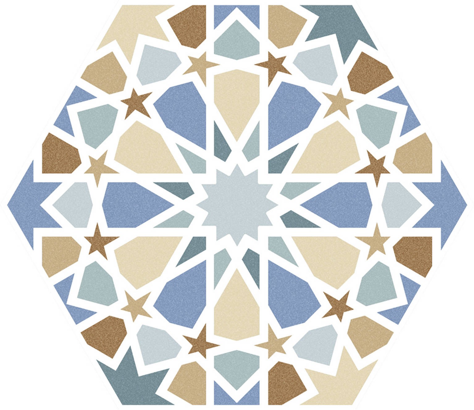 Hexa Al-Andalus Mix es una baldosa porcelánica esmaltada en formato hexagonal 23×27 cm, ideal para dar vida a suelos y paredes con un diseño original y vibrante. Con 24 diseños diferentes mezclados aleatoriamente, este modelo ofrece composiciones únicas y llenas de personalidad.