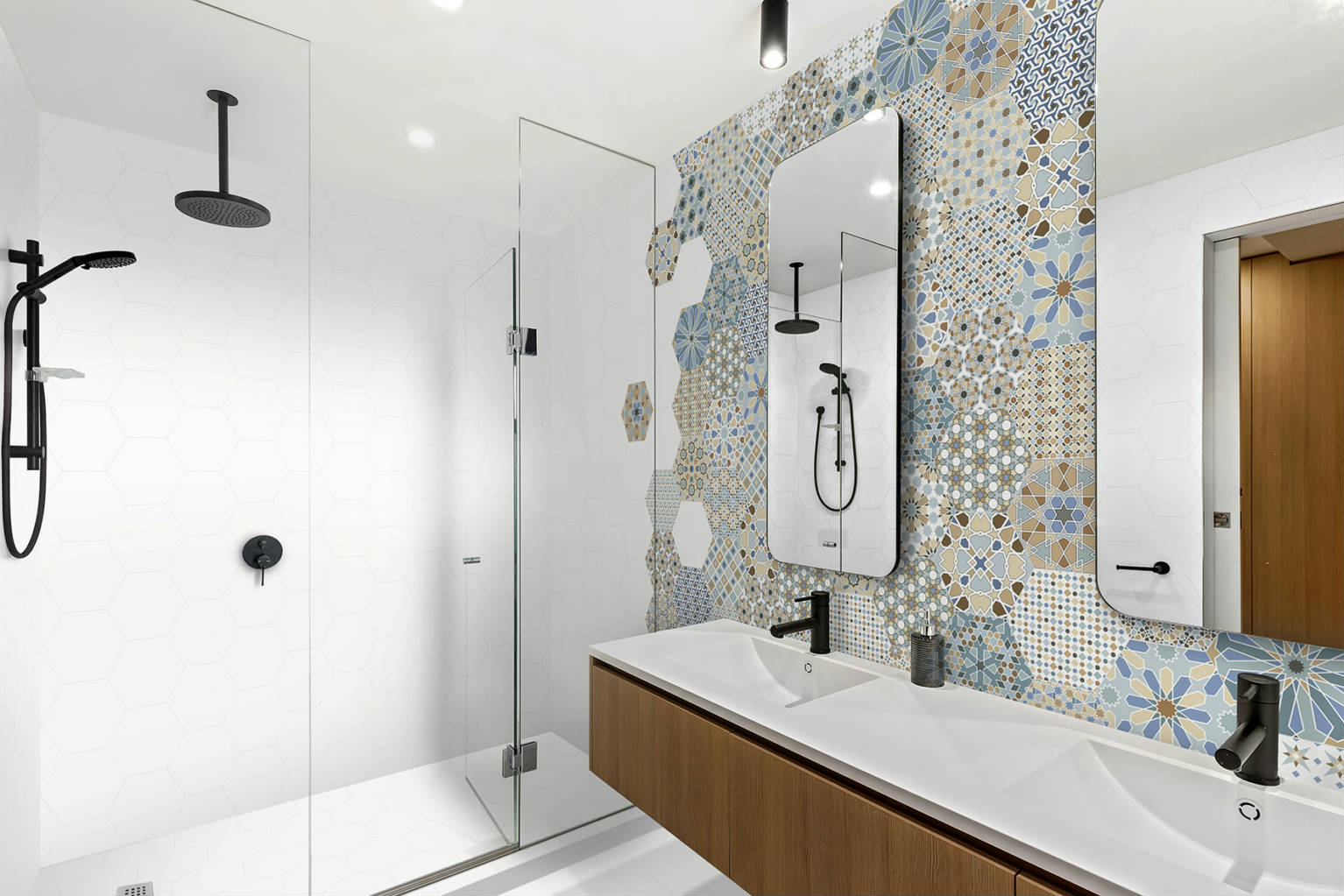 Inspirado en los suelos hidráulicos tradicionales, combina motivos florales, geométricos y ornamentales con un acabado mate que aporta elegancia y estilo artesanal. Su formato hexagonal permite romper la rigidez de los diseños clásicos, ofreciendo una alternativa creativa y decorativa en baños, cocinas, recibidores o zonas comerciales.