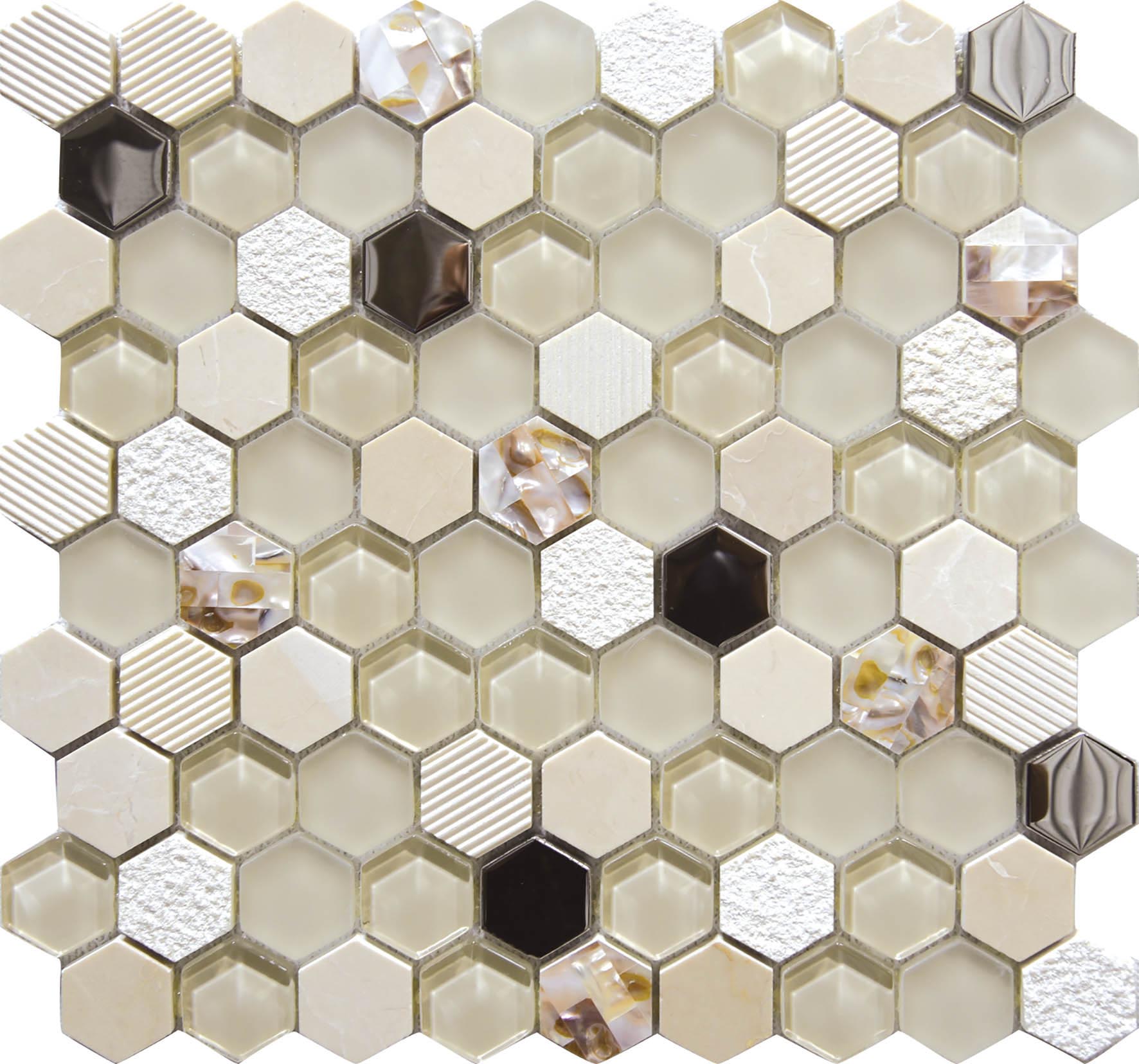 Formato de la malla 30,2×30,5 cm. Revestimiento.Tesela hexagonal. Soporte de malla de fibra de vidrio. Apto para duchas. Ideal para recubrir superficies curvas.