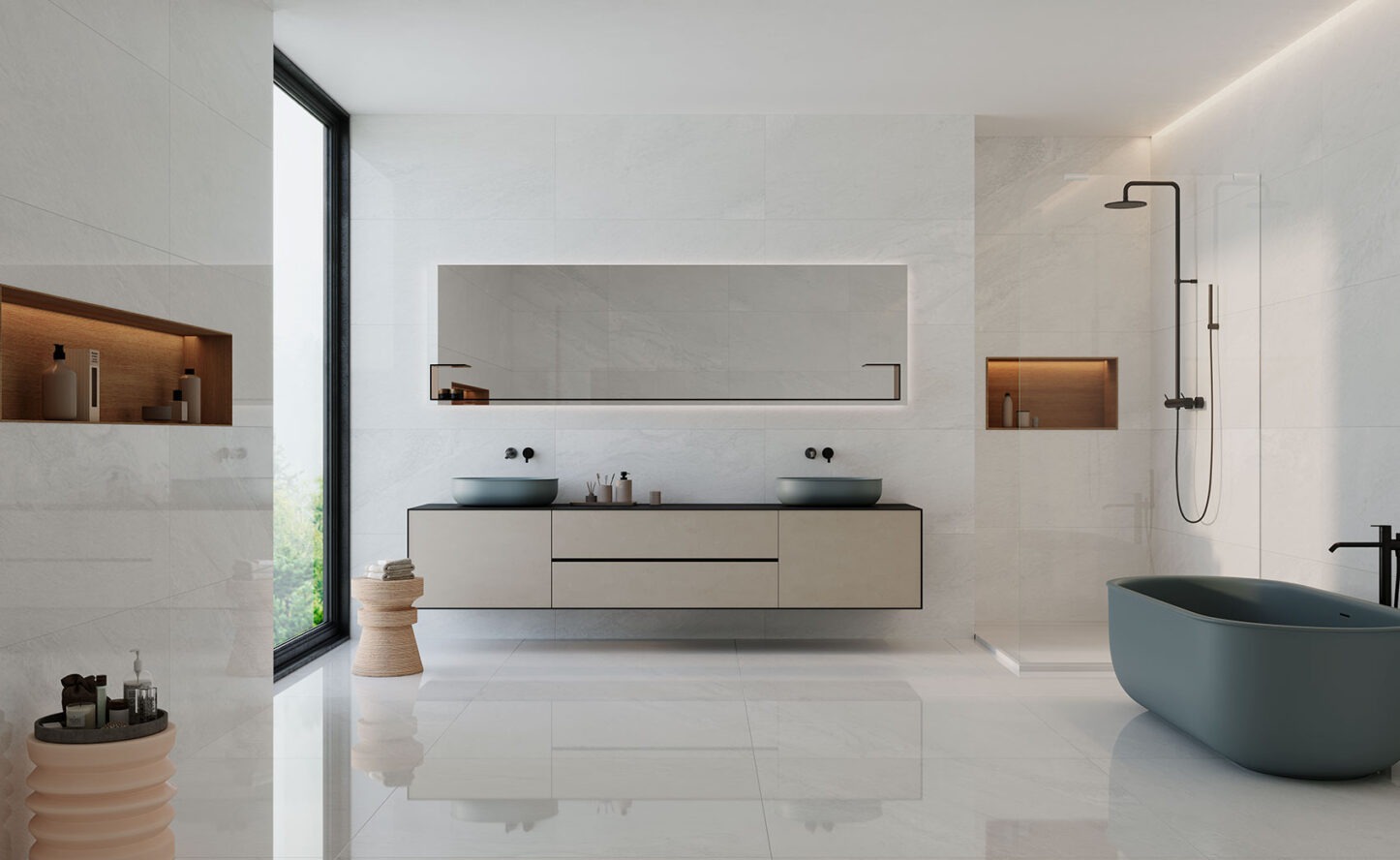 Piazza Polar destaca por su tono frío y luminoso, que aporta una sensación de amplitud y frescura a los espacios. Su acabado brillante refleja la luz, creando ambientes sofisticados y contemporáneos. Este porcelánico es especialmente adecuado para interiores modernos, donde la luminosidad y la estética minimalista son prioritarias.