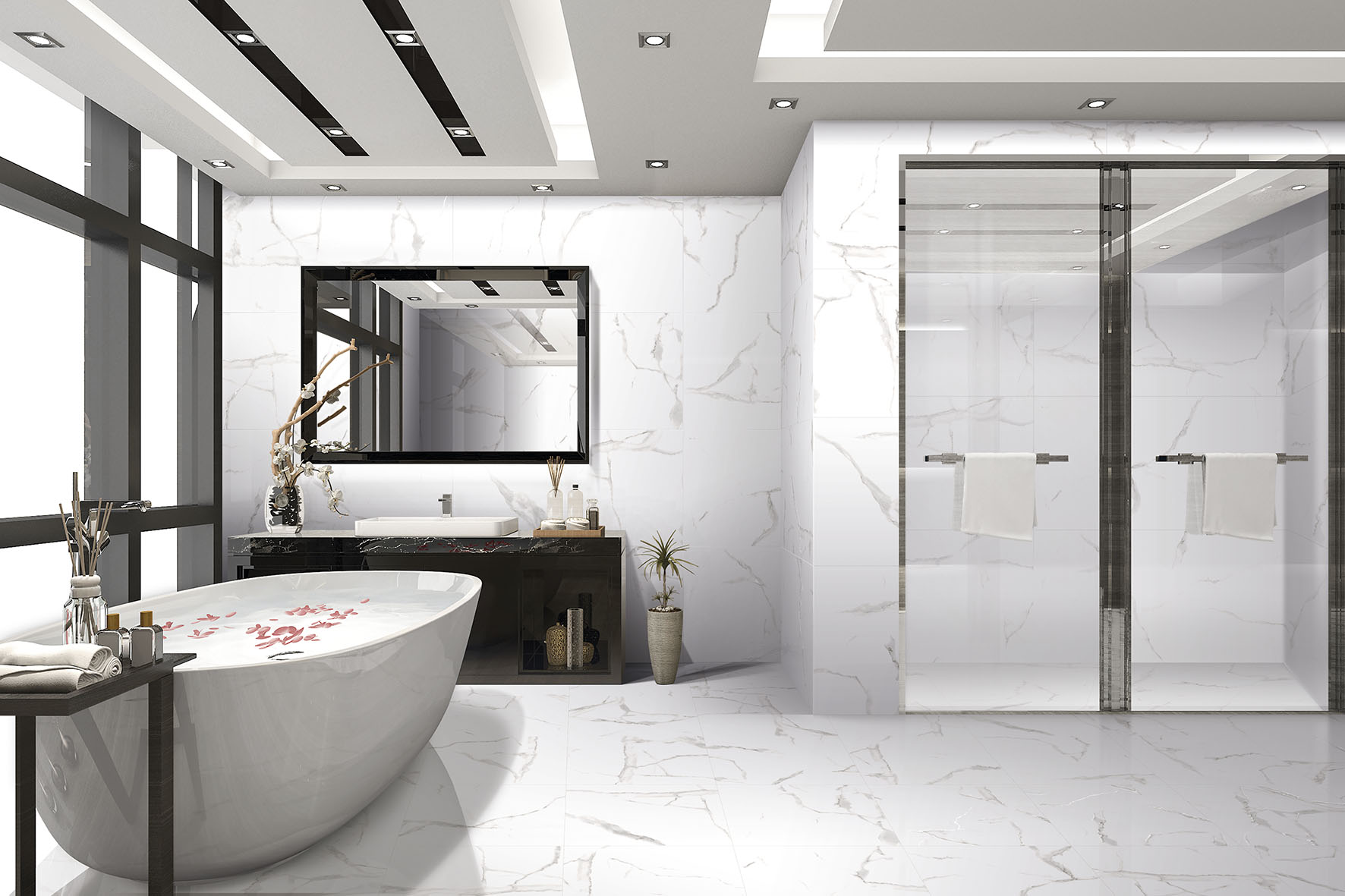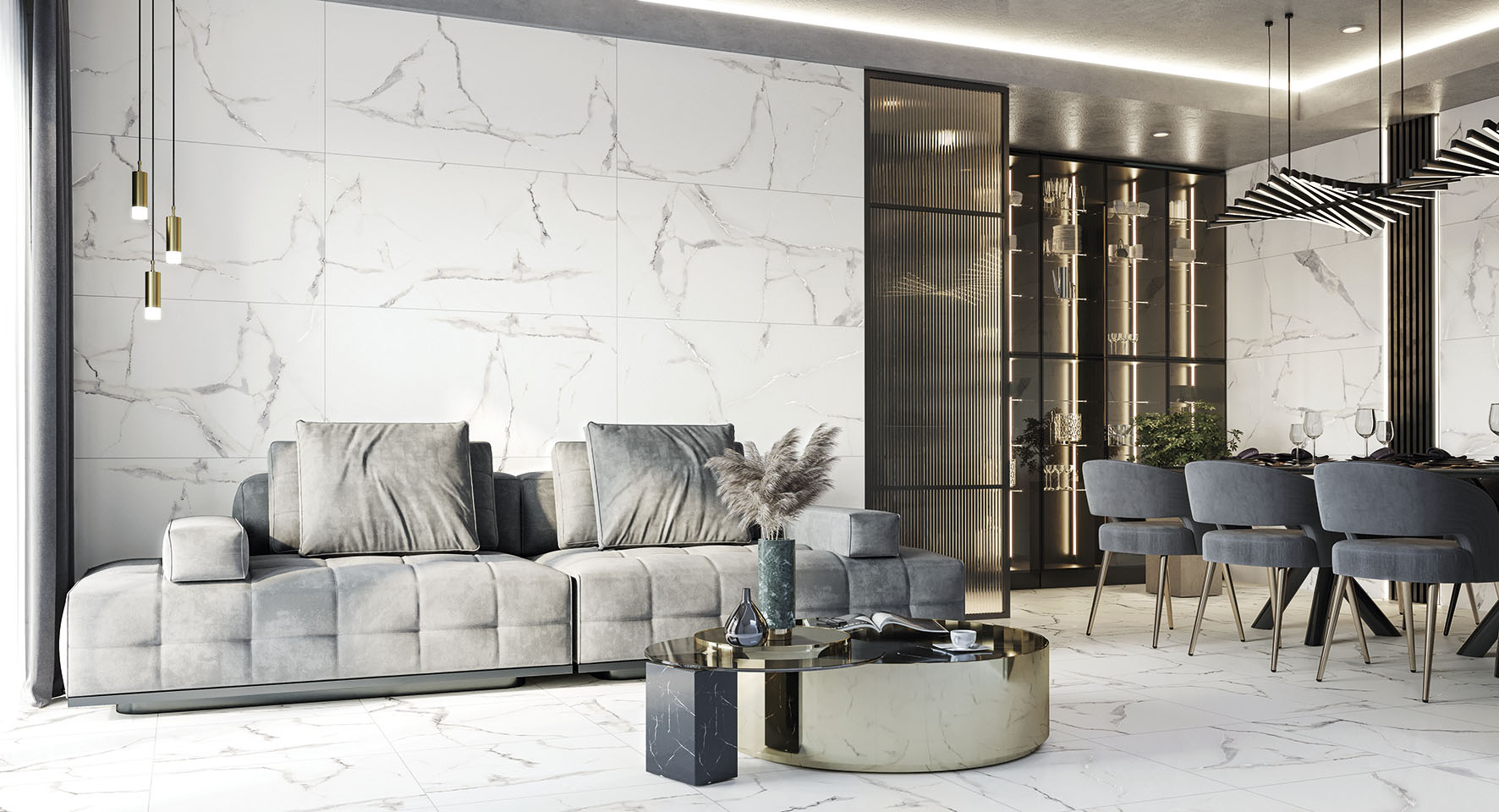 Serie de azulejo porcelánico 60×120 rectificado, mármol gran formato mate con vetas en brillo.