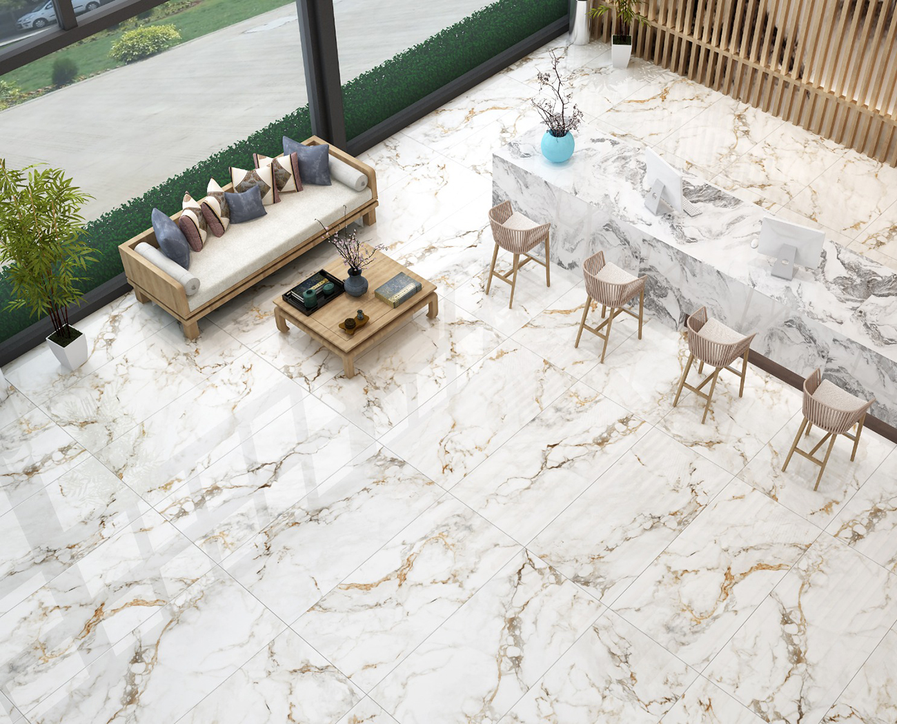 El formato de 60×120 cm no es casualidad; es la medida perfecta para maximizar la belleza del diseño efecto mármol. Al reducir el número de juntas por metro cuadrado (m²), el veteado puede fluir con mayor naturalidad, imitando las grandes losas de mármol que se encuentran en palacios y edificios históricos.