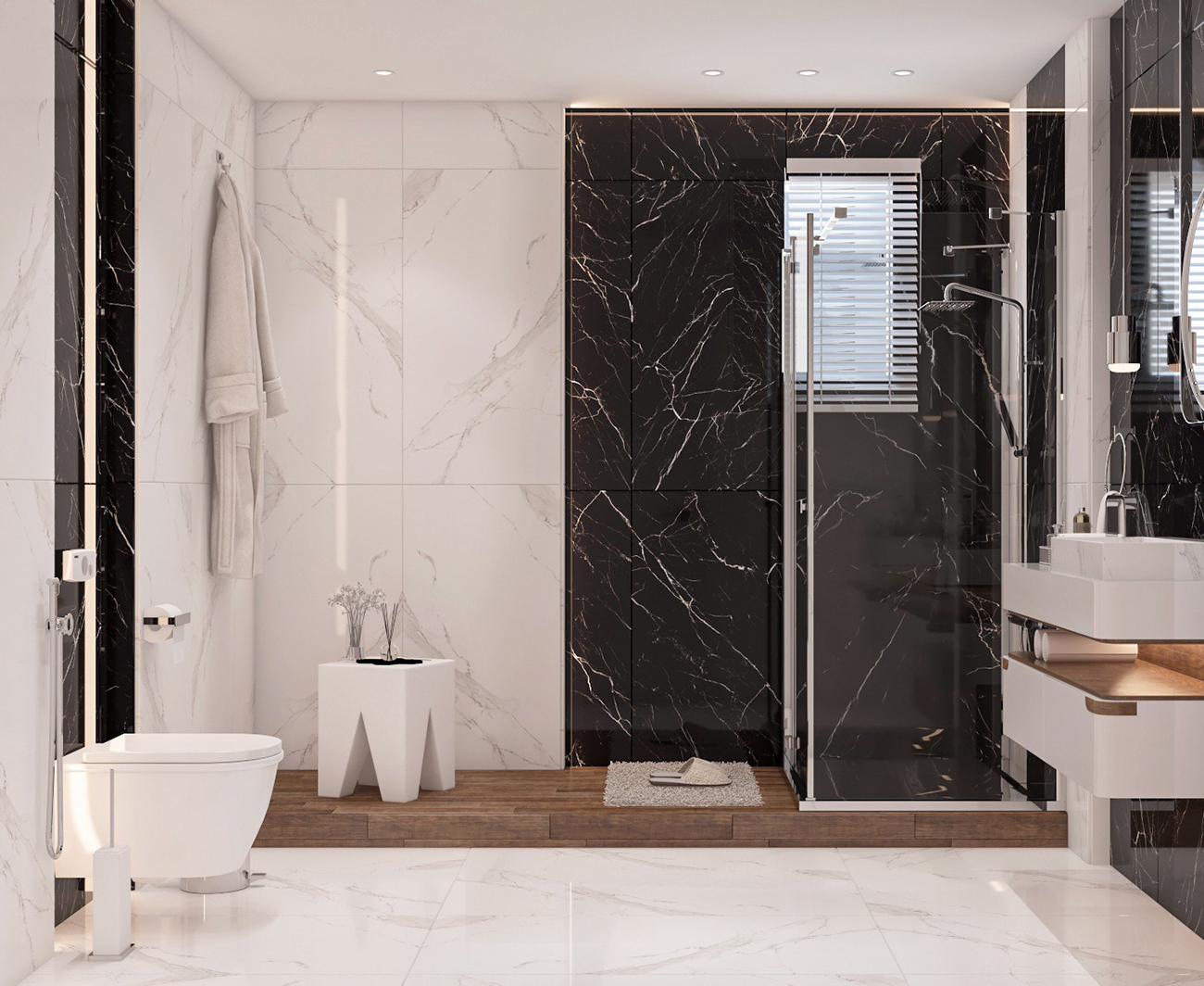 - Revestimiento Audaz: En baños y cocinas, utilizado como revestimiento, especialmente en duchas o paredes de acento, el CARRARA BLACK se combina a menudo con porcelánicos blancos (como el BOLONIA BLANCO 60×120) para crear un contraste clásico y atemporal.