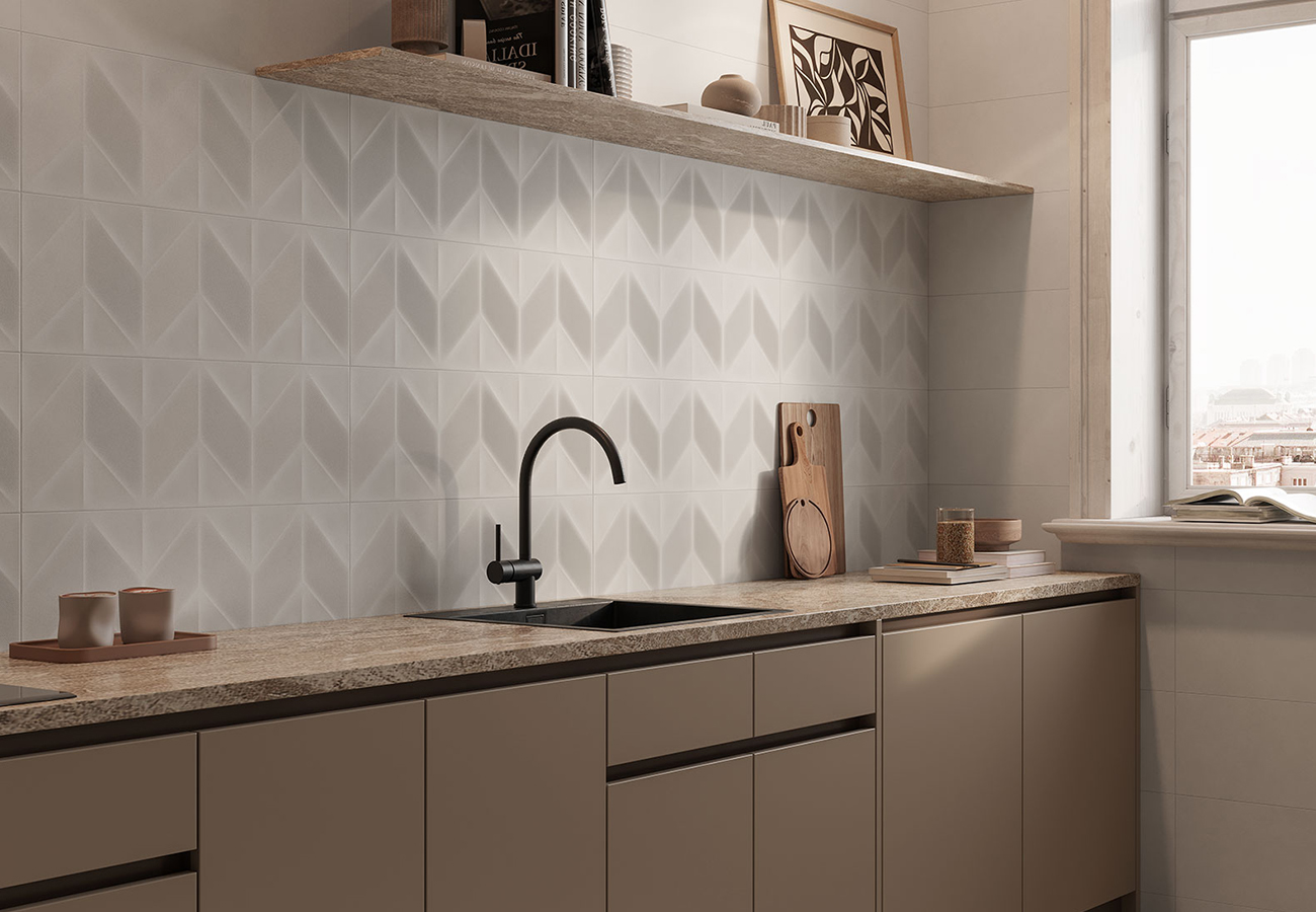 Su diseño en relieve permite múltiples aplicaciones, desde paredes principales hasta zonas de acento en combinación con otros acabados lisos de la misma serie. Su tonalidad neutra hace que combine perfectamente con encimeras de mármol, madera o superficies metálicas, permitiendo la creación de espacios sofisticados con un toque contemporáneo.