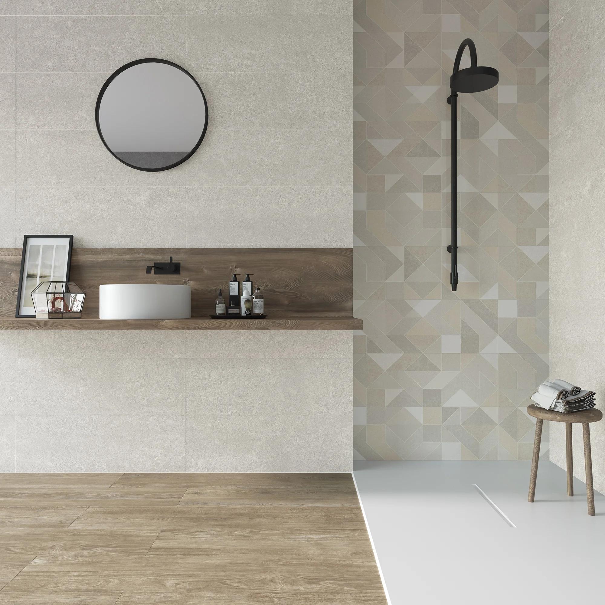 Para aquellos proyectos que buscan un toque diferenciador, la colección incluye los relieves Riv Odra (disponibles en Marfil y Perla). Estos decorados añaden una dimensión táctil y un juego de sombras que rompe la planitud de la pared, permitiendo zonificar espacios o crear paredes de acento con gran personalidad.