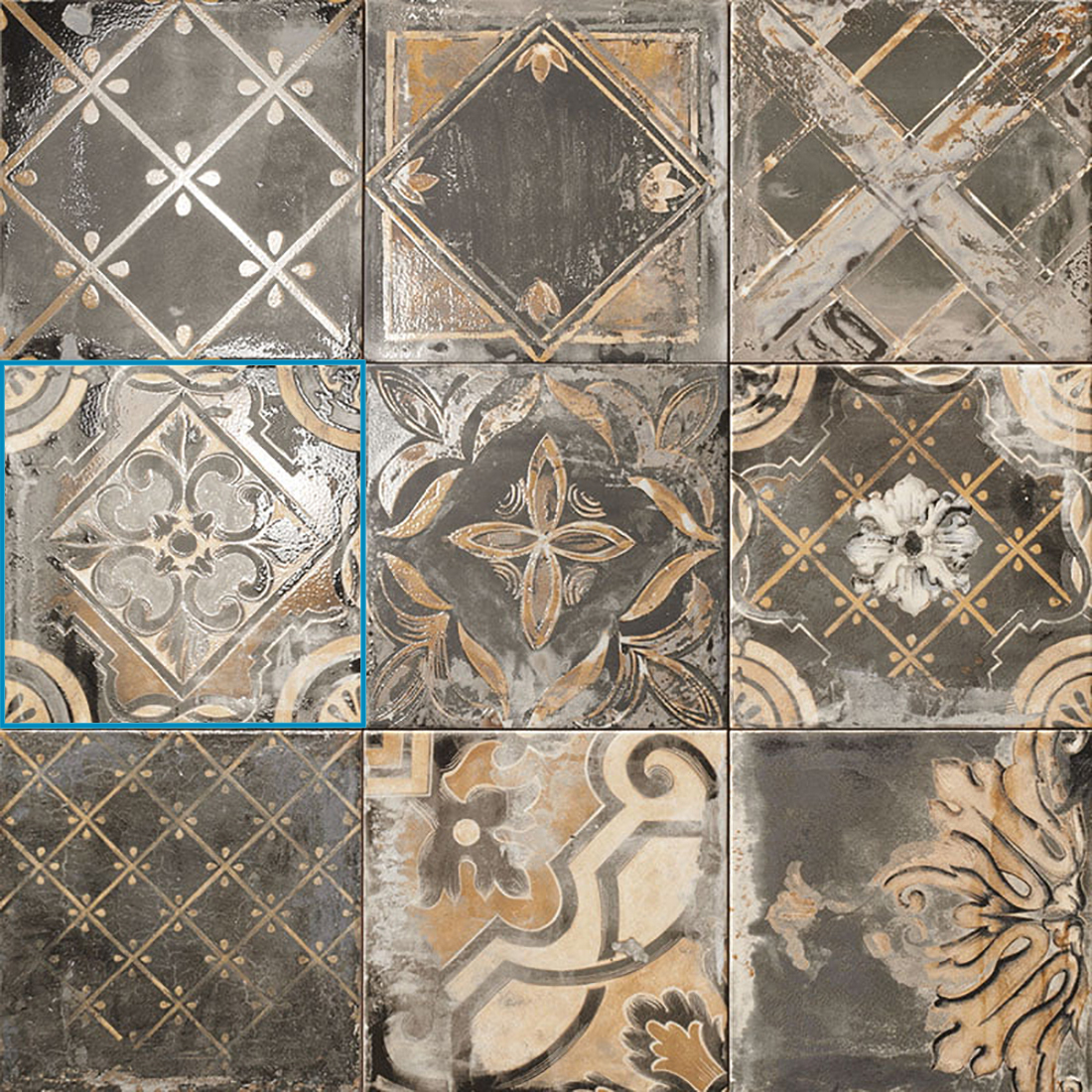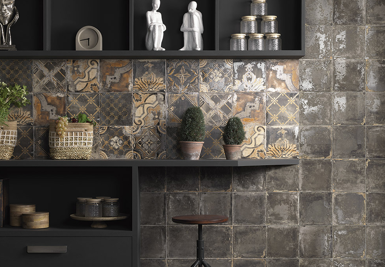 La belleza de este azulejo se debe a sus patrones geométricos y el contraste de tonos oscuros y neutros, que evocan el arte y la historia de Venecia, conocidos por su sofisticación y elegancia. El diseño con destellos y efectos visuales refuerza la atmósfera cálida y acogedora que se crea en cualquier espacio donde se instale.