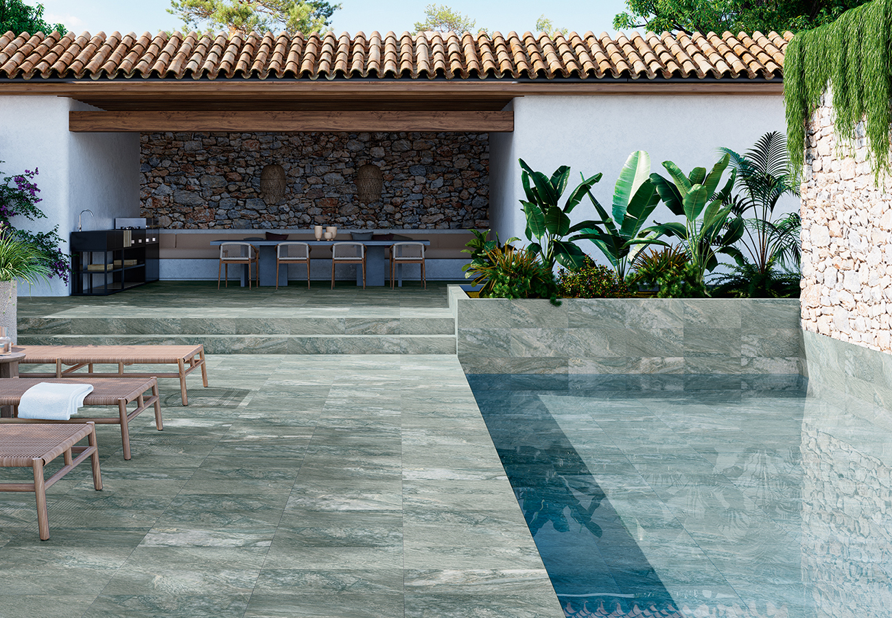 La Serie Sagano Emerald es perfecta si buscas un pavimento porcelánico verde mate antideslizante, con variación gráfica V3 y altas prestaciones técnicas, ideal tanto para interior como exterior.