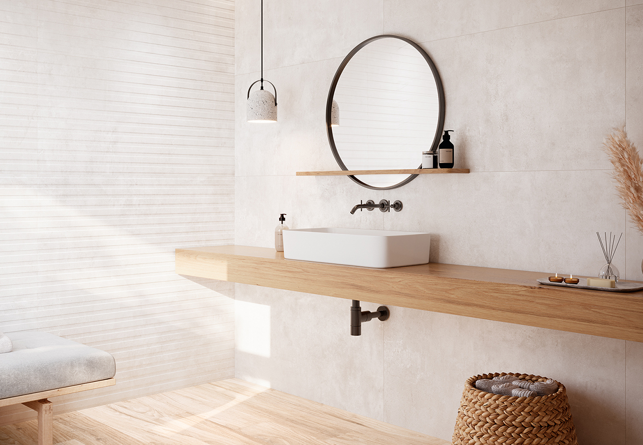 Todas las piezas son porcelánicas y rectificadas, lo que significa que han sido sometidas a un corte preciso de los bordes para permitir una colocación con juntas mínimas (de 1 a 2 mm). Esto potencia el efecto de amplitud y facilita el mantenimiento diario.