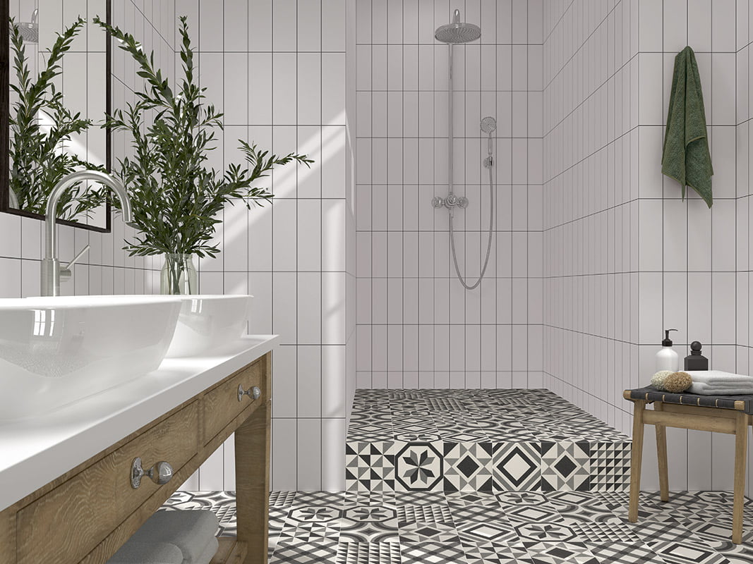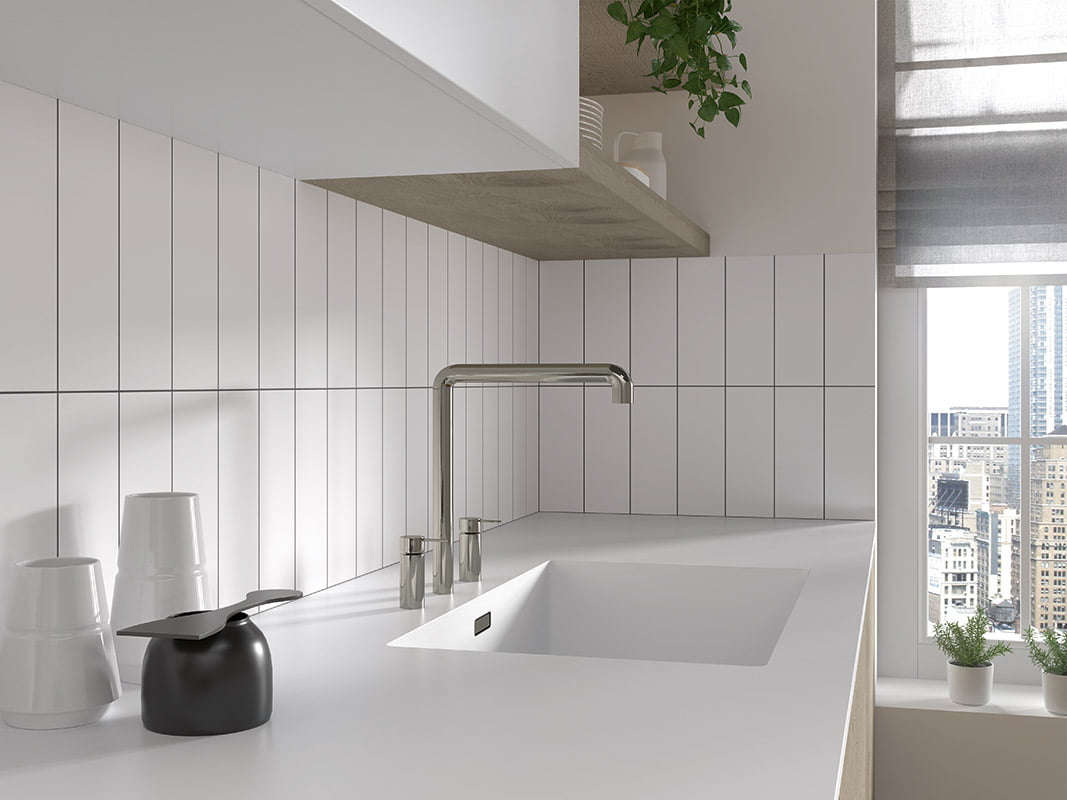 Serie de azulejos rectangulares de color blanco sólido con o sin bisel de estética elegante y minimalista que pueden combinarse en diferentes disposiciones.