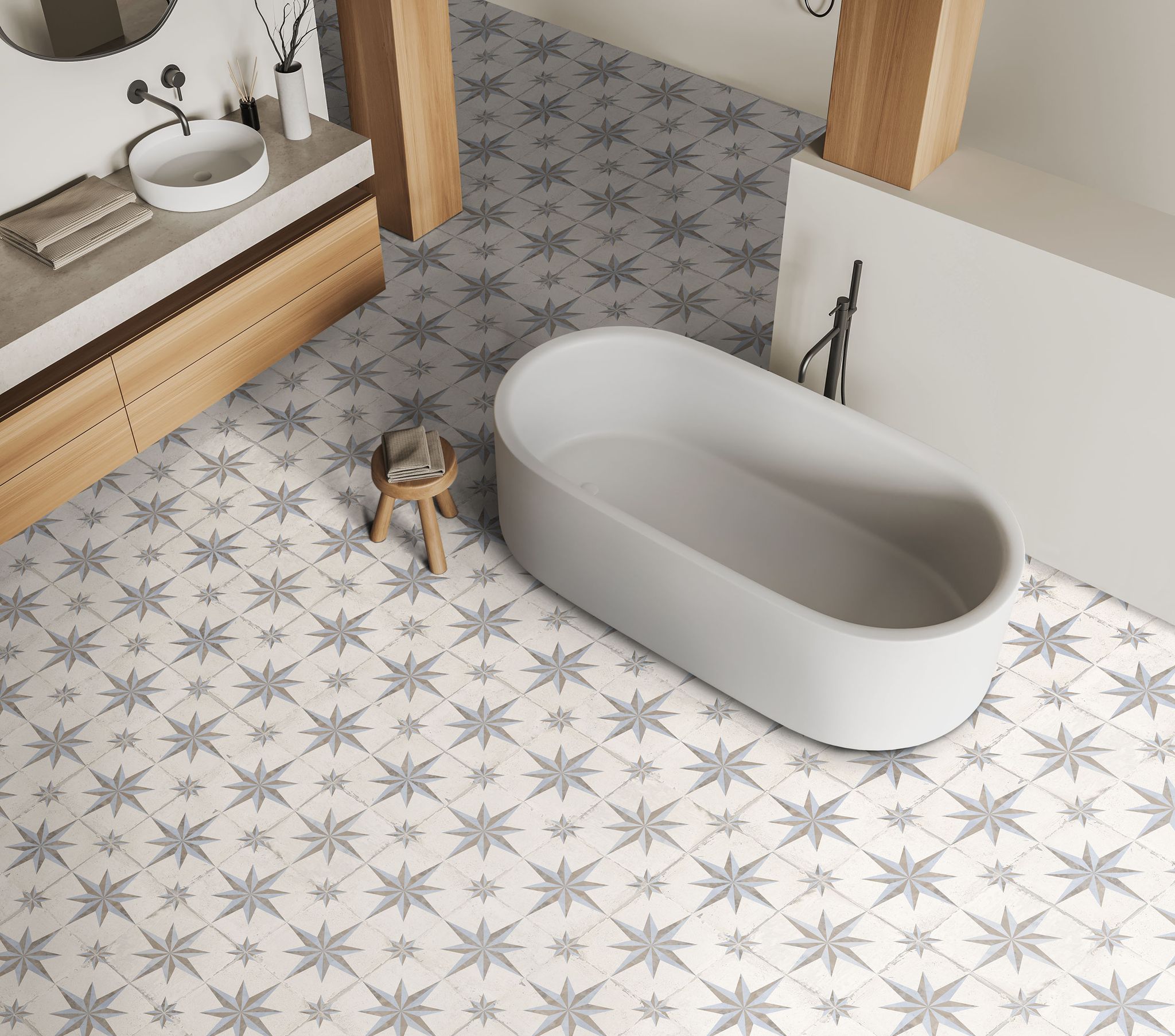 Vichy Sol es un porcelánico en formato 25×25 cm con acabado mate. Su diseño de estrellas en tonos beige, grises y azules crea un ambiente fresco y luminoso, ideal para suelos de cocinas, baños y áreas comerciales.